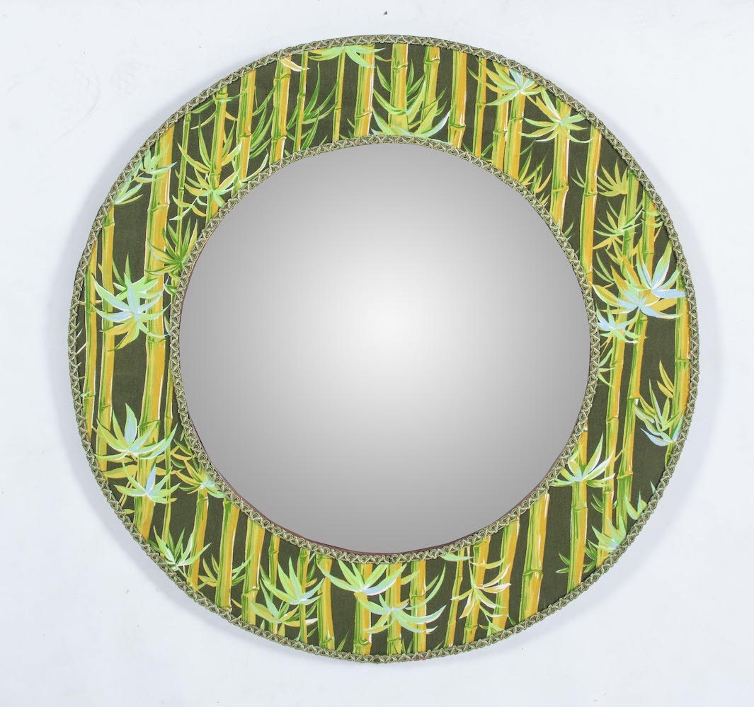 VALENTINO PIU’ Consolle in bamboo con legature in cuoio e tessuto con specchio in vetro e cornice in tessuto. Prod. Valentino più, Italia, 1980 ca. Consolle: cm 85x41x85; specchio: cm 76øx2.